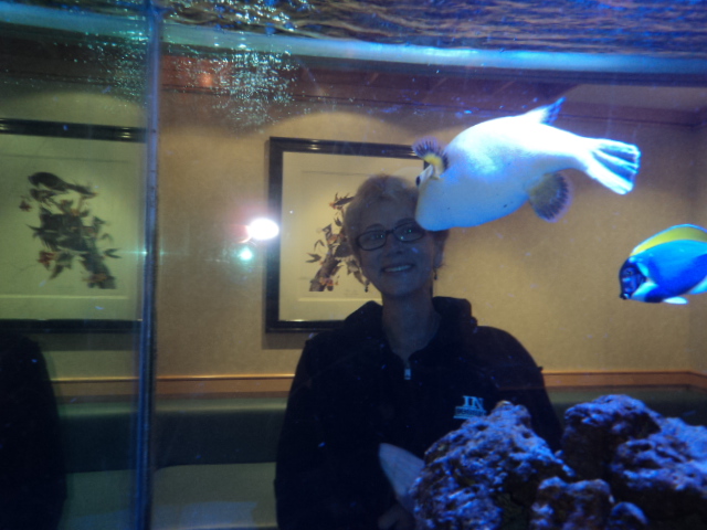 When I go upstairs to the treatment room, first you walk into a reception area to check in. It gives the nurses time to put in my cocktail order. And no I don’t mean my Cosmo. Though, wouldn’t that take the edge off. They mix up my drugs as I arrive, so everything is fresh. It is like a farmers market for chemicals in a way. Anyway, while we wait we get to watch this tropical fish tank. Filled with 3 fish and a big reef. Goldy – the big puffer fish, was being tortured today by a little blue “Dory” fish, and a Nemo. Meredith, Elaine and decided to speak (and use accents) that depict how we think the fish would sound (of course if they could talk) This activity kept us quite amused for the 10 minutes we waited. I even got a picture of Goldy, the bullied fish, and his attacker.